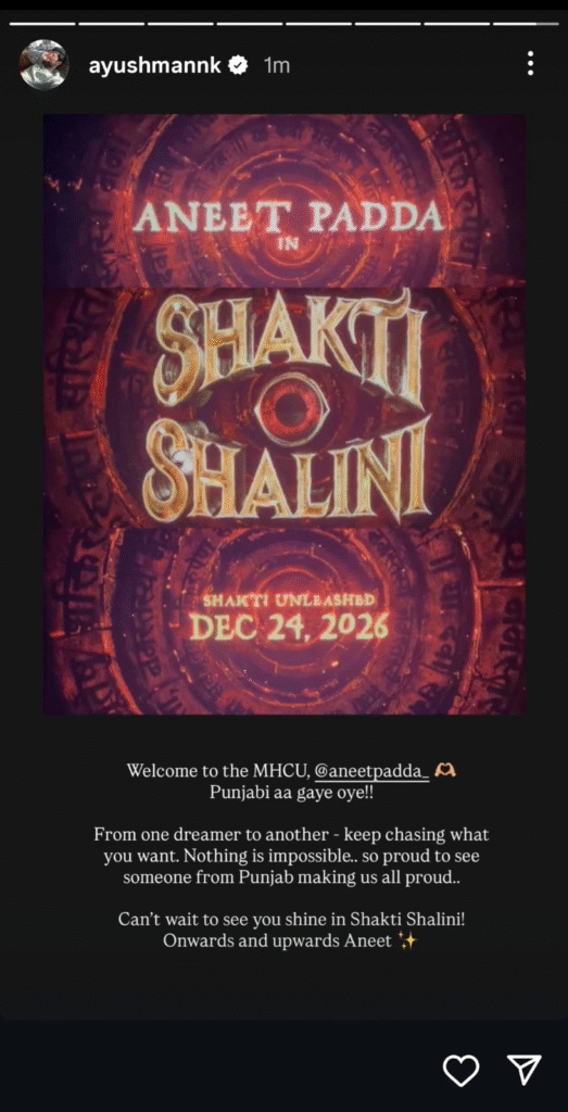 এক হৃদয়স্পর্শী মুহূর্তে আয়ুষ্মান ( Ayushmann) নিজের সামাজিক যোগাযোগমাধ্যম ইনস্টাগ্রাম-এ অনীতের নতুন ছবির ঘোষণা শেয়ার করেন। জানা যায়, থাম্মা(Thamma)র শুরুতেই ‘শক্তি শালিনী’(Shakti Shalini)-এর নাম ফুটে ওঠে উদ্বোধনী শিরোনামে। নিজের গল্পে আয়ুষ্মান লিখেছিলেন, “মাডক হরর-কমেডি ইউনিভার্সে স্বাগতম, অনীত! পাঞ্জাব আবার এসে গেছে ! এক স্বপ্নদ্রষ্টা থেকে আরেকজনের উদ্দেশে—কিছুই অসম্ভব নয়। তোমার সাফল্যে গোটা পাঞ্জাব গর্বিত। ‘শক্তি শালিনী’-তে তোমার আলো দেখার জন্য আর অপেক্ষা করতে পারছি না। এগিয়ে যাও, অনীত!” এই বার্তাটি মুহূর্তের মধ্যে ভাইরাল হয়ে যায়। নেটিজেনরা এই দু’জন পাঞ্জাবি তারকার উষ্ণ সম্পর্ককে অভিনন্দন জানান ।