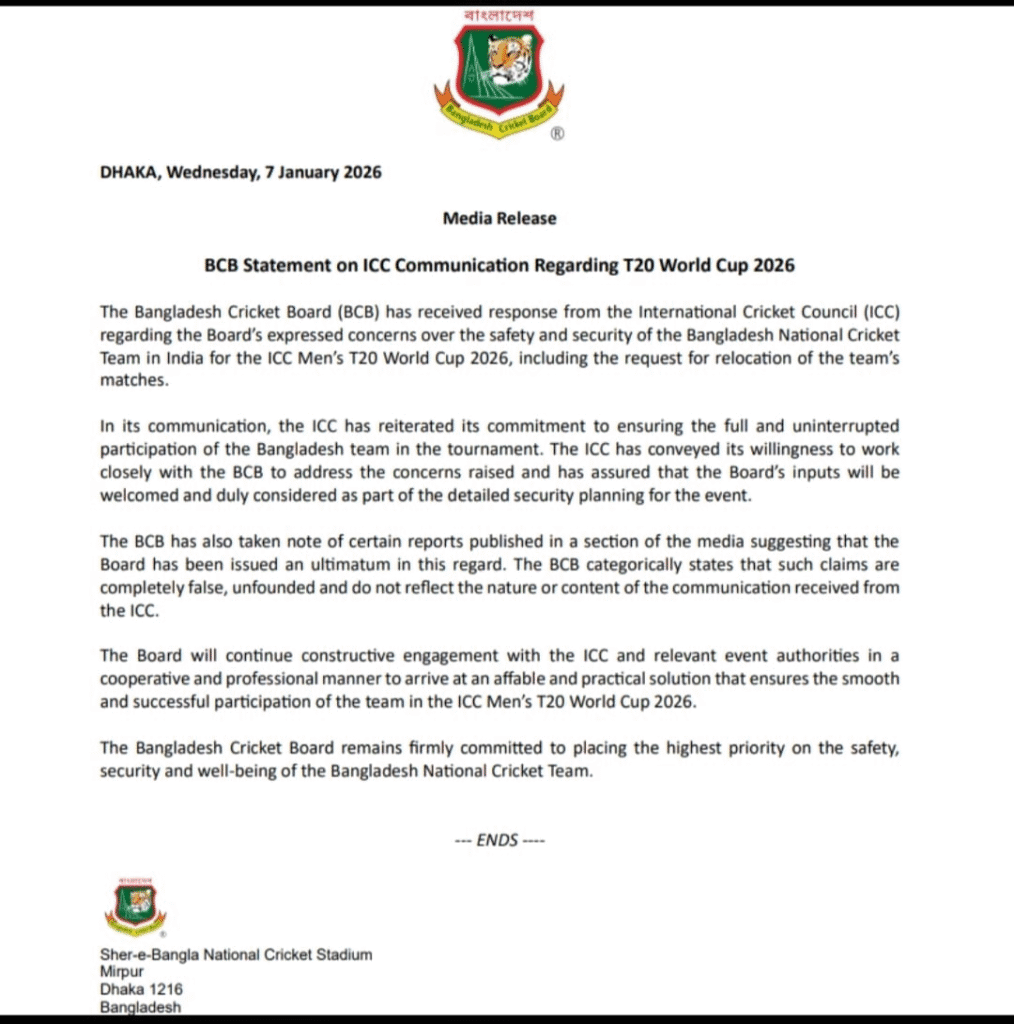 বাংলাদেশের পক্ষ থেকে আনুষ্ঠানিক বিবৃতি জারি করে বলা হয়েছে, ‘অনেক রিপোর্টে দাবি করা হচ্ছে ICC ইতিমধ্যেই চূড়ান্ত সিদ্ধান্ত জানিয়ে দিয়েছে। কিন্তু BCB স্পষ্ট জানাচ্ছে, এগুলি ভুয়ো খবর। আমাদের সঙ্গে ICC-র এমন কোনও আলোচনাই হয়নি। তবে জাতীয় ক্রিকেট দলের নিরাপত্তাই আমাদের কাছে সবচেয়ে বেশি গুরুত্বপূর্ণ।’ এখন সময় বলবে শেষ পর্যন্ত কী হয় (Bangladesh)।