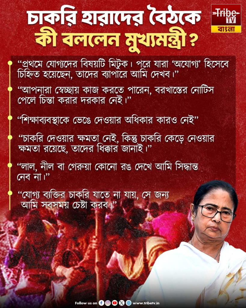 মুখ্যমন্ত্রী তাঁর বক্তব্যে রাজ্যের শিক্ষাব্যবস্থা নিয়ে গভীর উদ্বেগ প্রকাশ করেছেন এবং নিশ্চিত করেছেন যে, সরকার যতটা সম্ভব মানবিকভাবে পরিস্থিতির সমাধান করবে। বৈঠকে উপস্থিত সকলের উদ্দেশ্যে তিনি বলেছেন, “নিশ্চিন্ত থাকুন, যোগ্যদের চাকরি নিশ্চিত করার জন্য সরকার সঠিক ব্যবস্থা নেবে।”