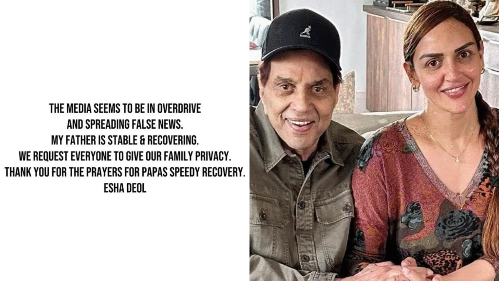 এর আগে ধর্মেন্দ্র পুত্র সানি দেওলের টিম বিবৃতি দিয়ে জানিয়েছে, পুরোটাই জল্পনা। ধর্মেন্দ্রর শারীরিক অবস্থা এখন স্থিতিশীল। বিবৃতি বলা হয়েছে, ‘ধর্মেন্দ্র ভেন্টিলেশনে নেই। অভিনেতার শারীরিক অবস্থার যদি বাড়াবাড়ি হতো, তা হলে পরিবারের সকলেই হাসপাতালে উপস্থিত থাকতেন। অভিনেতার ছেলে সানি দেওল সকালেই বাবাকে হাসপাতালে দেখে এসছেন (Esha Deol)।’