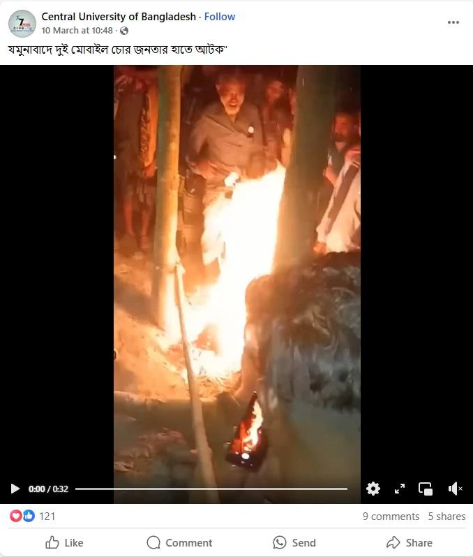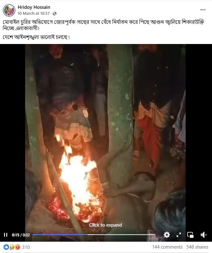 একই ভিডিও গত ১০ মার্চ আরেক ব্যবহারকারী পোস্ট করে লেখেন, “মোবাইল চুরির অভিযোগে জোরপূর্বক গাছের সাথে বেঁধে নির্যাতন করে পিছে আগুন জ্বালিয়ে শিকারউক্তি নিচ্ছে এলাকাবাসী। দেশে আইনশৃঙ্খলা ভালোই চলছে !”