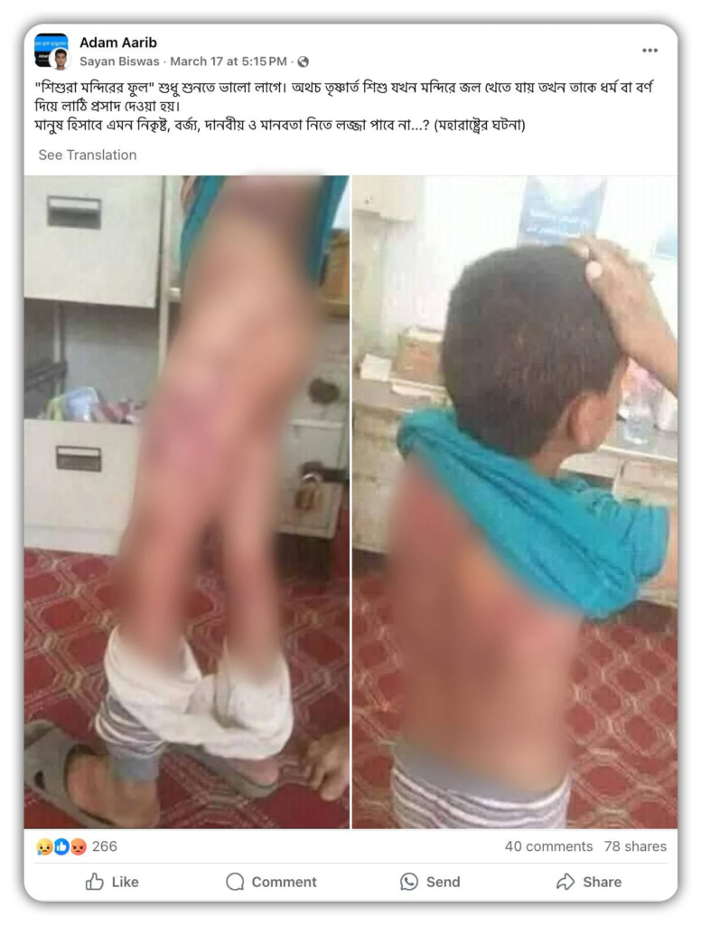 উদাহরণস্বরূপ, এক ফেসবুক (Fact Check) ব্যবহারকারী ভাইরাল ছবি দুটি শেয়ার করে লিখেছেন, “শিশুরা মন্দিরের ফুল, শুধু শুনতে ভালো লাগে। অথচ তৃষ্ণার্ত শিশু যখন মন্দিরে জল খেতে যায় তখন তাকে ধর্ম বা বর্ণ দিয়ে লাঠি প্রসাদ দেওয়া হয়। মানুষ হিসাবে এমন নিকৃষ্ট, বর্জ্য, দানবীয় ও মানবতা নিতে লজ্জা পাবে না…? (মহারাষ্ট্রের ঘটনা)”