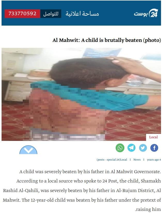 ২০২০ সালের ৫ অক্টোবর ইয়েমেন ভিত্তিক অপর এক সংবাদমাধ্যম Alnabba Alyemeni-তেও এই একই ছবি এবং তথ্য-সহ অন্য একটি প্রতিবেদন পাওয়া যায়। সেই প্রতিবেদন অনুযায়ী, ২০২০ সালের ৩ অক্টোবর নিজেরে ১৪ বছর বয়সী সন্তান শামাখ রশিদ আল-কাহিলিকে মানুষ করার অজুহাতে দড়ি দিয়ে বেঁধে চাবুকের সাহায্যে ব্যাপকভাবে মারধর করে তার বাবা রশিদ মুহাম্মদ আল-কুহাইলি। এই ঘটনা প্রকাশ্যে আসতেই আল-মাহউইত গভর্নরেটের আল রাজম জেলার পুলিশ ৪০ বছর বয়সী অভিযুক্ত রশিদ মুহাম্মদ আল-কুহাইলিকে গ্রেফতার করে।