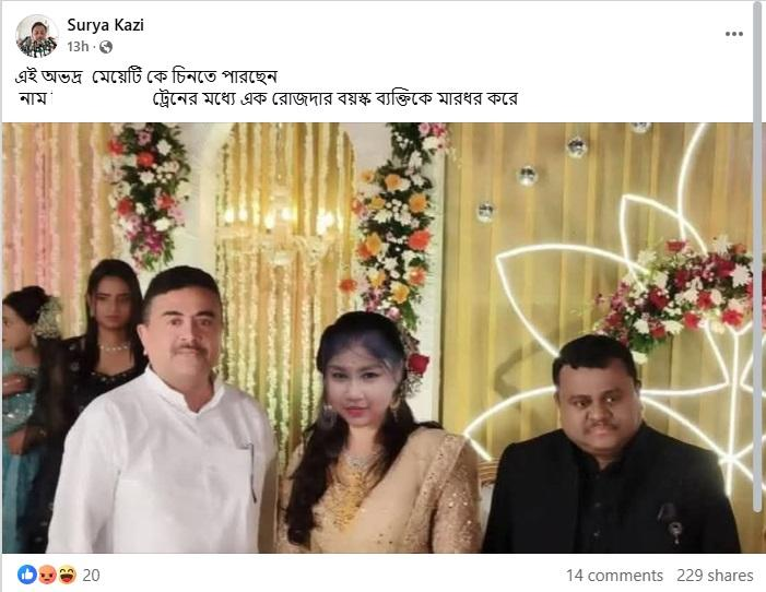 এই তরজার মাঝে সোশ্যাল মিডিয়ায় (Fact Check) একটি ছবি দেখা যাচ্ছে। এই ছবির একপাশে শুভেন্দু ও অপরপাশে কাঁথির সাংসদ সৌমেন্দু অধিকারীকে দেখতে পাওয়া যাচ্ছে। তাঁদের মাঝে এক মহিলাও দাঁড়িয়ে রয়েছেন। তিনিই নাকি সেই মহিলা যিনি ওই মুসলিম ব্যক্তিকে মারধর করেছিলেন বলে একাধিক সোশ্যাল মিডিয়া ব্যবহারকারী দাবি করছেন। সেই সঙ্গে পোস্ট শেয়ার করা নেটিজেনদের বক্তব্য, এর থেকেই প্রমাণ হয় ওই তরুণীর শুভেন্দু, বিজেপি এবং আরএসএস-র সঙ্গে যোগসাজশ রয়েছে। ওই মহিলার নিরাপত্তার কথা মাথায় রেখে এই প্রতিবেদনে তাঁর নাম প্রকাশ করা হচ্ছে না।