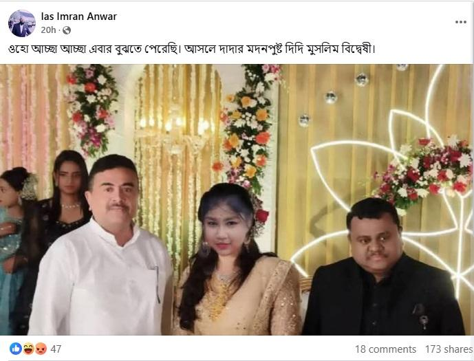 তিনি শুভেন্দু অধিকারীর ভাই, সাংসদ সৌমেন্দু অধিকারীর বিয়ে পরবর্তী বৌভাত অর্থাৎ প্রীতিভোজ অনুষ্ঠানে যোগ দিয়ে নিজের এক্স হ্যান্ডেলে চারটি ছবি পোস্ট করেছিলেন যার মধ্যে এই ছবিও ছিল একটি। তবে সেখানে শুভেন্দু ও সৌমেন্দুর মাঝে ওই বিতর্কিত তরুণীকে নয়, বরং সৌমেন্দুর নব্য বিবাহিতা স্ত্রী’কে দেখা যাচ্ছিল।