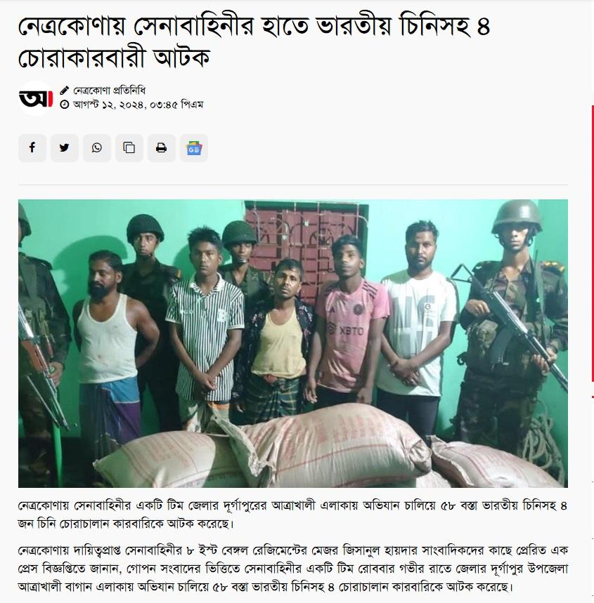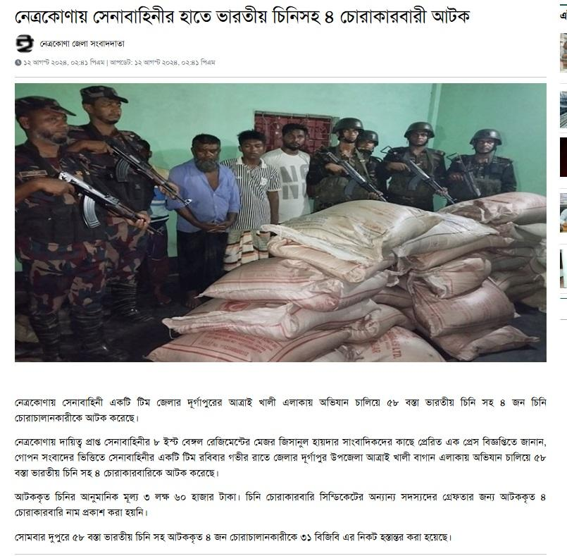প্রতিবেদনটিতে আরও উল্লেখ করা (Fact Check) হয়েছে, “গোপন সংবাদের ভিত্তিতে সেনাবাহিনীর একটি টিম রবিবার গভীর রাতে জেলার দূর্গাপুর উপজেলা আত্রাই খালী বাগান এলাকায় অভিযান চালিয়ে ৫৮ বস্তা ভারতীয় চিনি সহ ৪ চোরাকারবারিকে আটক করেছে। আটককৃত চিনির আনুমানিক মূল্য ৩ লক্ষ ৬০ হাজার টাকা। চিনি চোরাকারবারি সিন্ডিকেটের অন্যান্য সদস্যদের গ্রেফতার জন্য আটককৃত ৪ চোরাকারবারি নাম প্রকাশ করা হয়নি। সোমবার দুপুরে ৫৮ বস্তা ভারতীয় চিনি সহ আটককৃত ৪ জন চোরাচালানকারীকে ৩১ বিজিবি এর নিকট হস্তান্তর করা হয়েছে।”