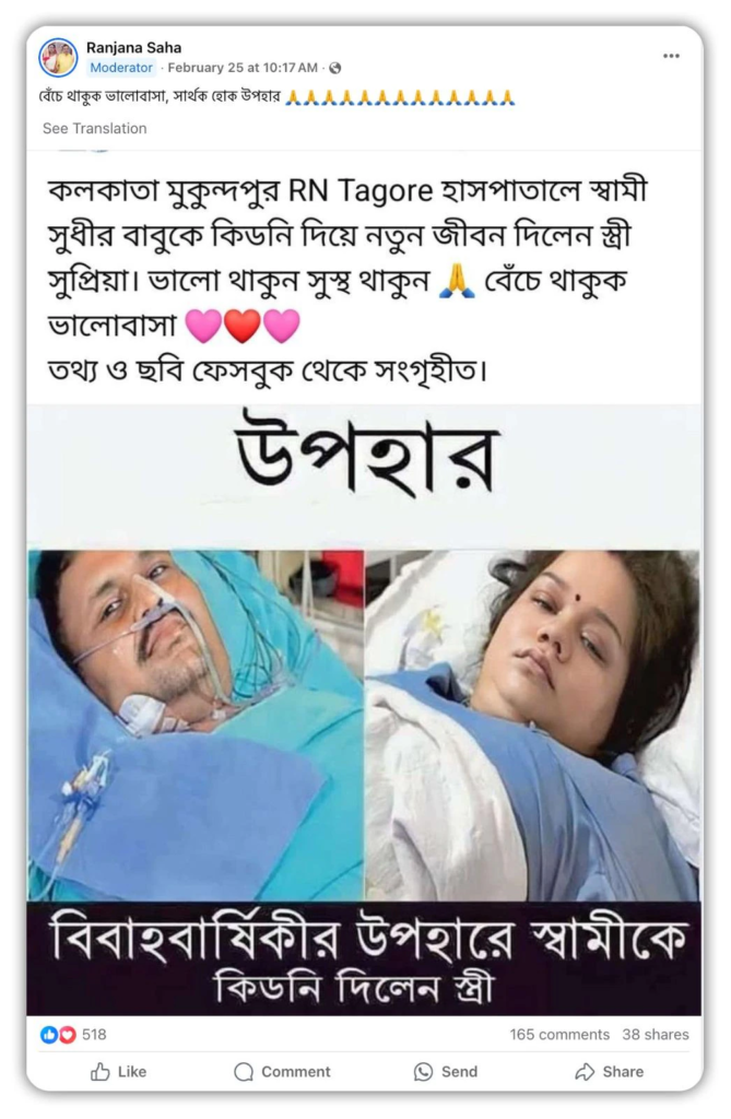 পোস্টের দাবি অনুযায়ী, অসুস্থ ব্যক্তির নাম সুধীর এবং প্রাণ বাঁচানো স্ত্রীর নাম (Fact Check) সুপ্রিয়া। ছবি-সহ এই পোস্ট শেয়ার করে ক্য়াপশনে লেখা হয়েছে, “কলকাতা মুকুন্দপুর RN Tagore হাসপাতালে স্বামী সুধীর বাবুকে কিডনি দিয়ে নতুন জীবন দিলেন স্ত্রী সুপ্রিয়া। ভালো থাকুন সুস্থ থাকুন বেঁচে থাকুক ভালোবাসা।”