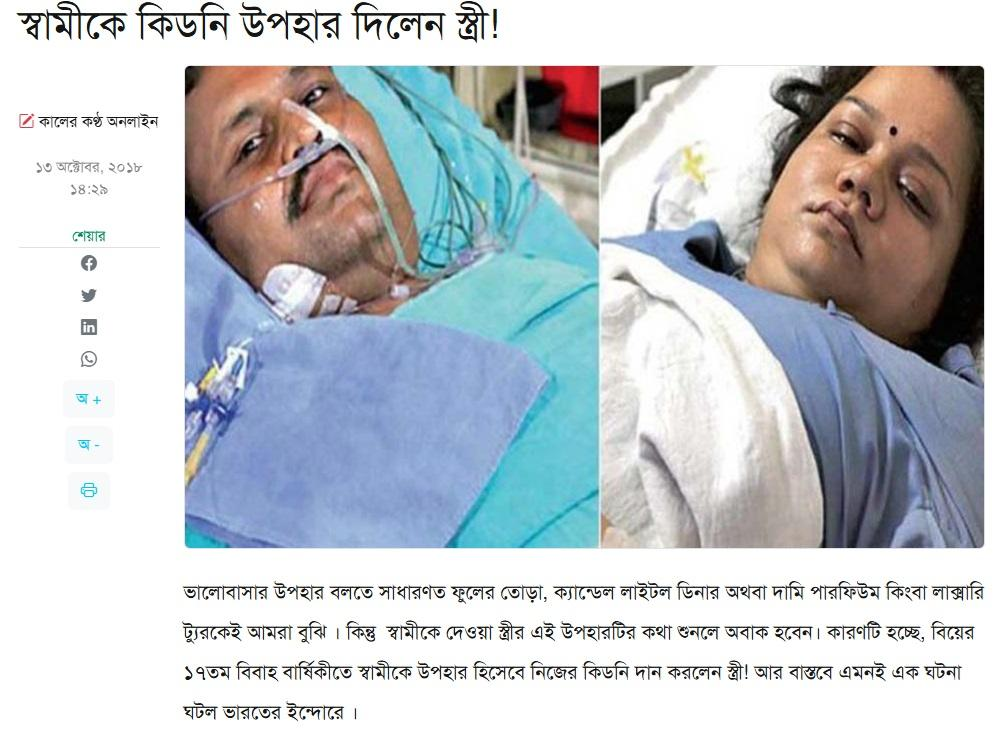 ছবিটি প্রকাশ করে লেখা হয়, এই ঘটনাটি মধ্য প্রদেশের ইন্দোর শহরে ঘটেছিল। কিডনির সমস্যায় ভোগা স্বামী রবিদত্ত সোনিকে বাঁচাতে স্ত্রী প্রভা প্রথমে হাসপাতালে ভর্তি করেন। ডায়লিসিস চলে। কিন্তু তাতেও কাজ না হওয়ায় ডাক্তার জানিয়ে দেন কিডনি প্রতিস্থাপন করতে হবে। তখন চিকিৎসকদের প্রভা জানান, তিনিই স্বামীকে কিডনি দেবেন।