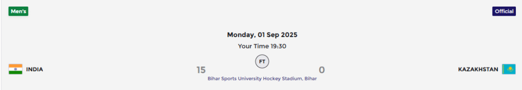 এই টুর্নামেন্ট থেকে আগেই ছিটকে গিয়েছিল কাজাখস্তান। ফলে এই ম্যাচে তাদের হারানোর মতো কিছু না থাকলেও এই ফল যেন অপ্রত্যাশিত ছিল। প্রথম কোয়ার্টারেই তিন গোলে লিড নেয় ভারত। ম্যাচের পঞ্চম ও অষ্টম মিনিটে গোল আসে অভিষেকের হাত ধরে। ১৫ মিনিটে গোলের ব্যবধান বাড়ান সুখজিৎ সিং। অভিষেক নিজের হ্যাটট্রিক সম্পূর্ণ করেন ২০ মিনিটের মাথায়। তৃতীয় কোয়ার্টার শেষ হওয়ার আগে নিজের হ্যাটট্রিক যখন সম্পূর্ণ করেন সুখজিৎ তখন ভারতের স্কোর দাঁড়ায় ১১-০। দিলপ্রীত সিং ও সঞ্জয় সেদিন গোল পেয়েছেন। শেষ পর্যন্ত ভারত যখন খেলা শেষ করে স্কোর বোর্ড তখন ১৫-০, ফলে বোঝাই যায় গোটা ম্যাচের রাশ ছিল ভারতের হাতে (Hockey Asia Cup)।