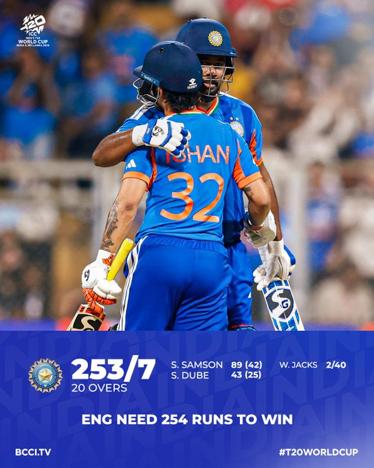 সেমিফাইনালের দ্বিতীয় ম্যাচে ওয়াংখেড়েতে টস জিতে ফিল্ডিংয়ের সিদ্ধান্ত নেয় ইংল্যান্ড। প্রথমে ব্যাট করতে নেমে শুরুটা ভাল করেন সঞ্জু স্যামসন। এই ম্যাচে সুযোগ ছিল অভিষেকের ঘুরে দাঁড়ানোর কিন্তু সেগুড়ে বালি। সেই অফ স্পিনারের সামনে পরাস্ত হলেও অভিষেক। বড় শট খেলার পর সেই তাড়াহুড়ো করতে গিয়ে উইকেট ছুঁড়ে দিয়ে এলেন তিনি। অন্যদিকে ১৫ রানের থাকা সঞ্জুর ক্যাচ ফেলে ইংল্যান্ড। যার খেসারত দিতে হলো ইংল্যান্ডের বোলারদের। একের পর এক বড় শটে বোলারদের লাইন লেংথ বিগড়ে দিলেন এই তারকা ব্যাটার (IND vs ENG)।