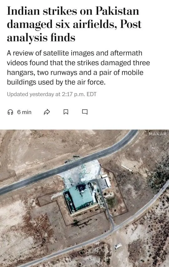 ট্রাইব টিভি বাংলা ডিজিটাল: ওয়াশিংটন পোস্টের এক প্রতিবেদন অনুসারে, সাম্প্রতিক ভারত-পাকিস্তান সংঘর্ষে ভারতীয় বিমান বাহিনী কমপক্ষে ছয়টি পাকিস্তানি বিমান ঘাঁটির ক্ষতি করেছে (Indo-Pak Issue)। পাকিস্তান শুরু থেকেই তাদের ক্ষতি গোপন করে আসছিল, কিন্তু স্যাটেলাইট চিত্রগুলি তা প্রকাশ করে দিয়েছে। বিশেষজ্ঞরা বিশ্বাস করেন যে এটি দক্ষিণ এশিয়ার ইতিহাসে সবচেয়ে বড় বিমান হামলা।