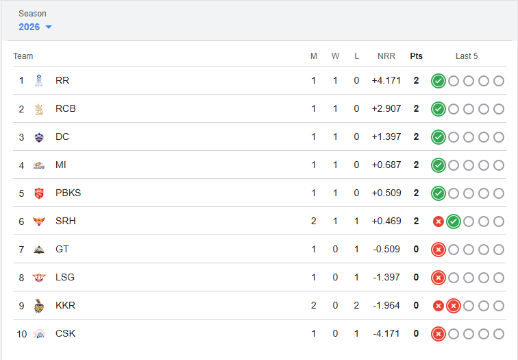পয়েন্ট টেবিলে এই মুহূর্তে এক নম্বরে রয়েছে রাজস্থান রয়্যালস, তাঁদের সংগ্রহে রয়েছে দুই পয়েন্ট। বেঙ্গালুরুও ২ পয়েন্ট নিয়ে রয়েছে তালিকার দ্বিতীয় স্থানে। এরপরে যথাক্রমে রয়েছে দিল্লি, মুম্বই, পাঞ্জাব এবং হায়দরাবাদ। প্রতিটা দলের সংগ্রহে রয়েছে দুই পয়েন্ট করে কিন্তু নেট রান রেটের বিচারে দলগুলির অবস্থান আলাদা।