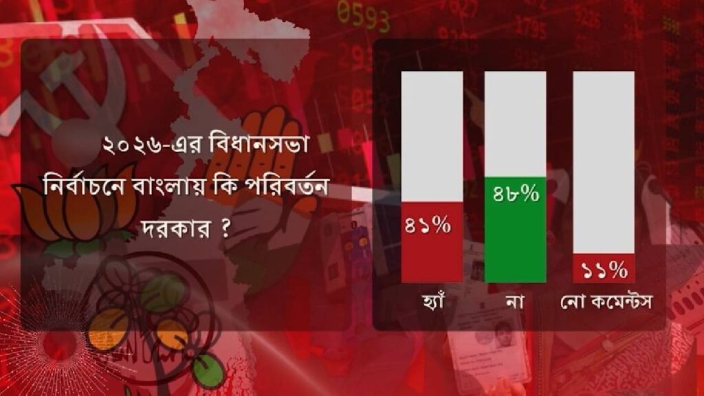 K TV বাংলার এই জনমত সমীক্ষায় প্রশ্ন ছিল ২০২৬-এর বিধানসভা নির্বাচনে বাংলায় কি পরিবর্তন দরকার ? হ্যাঁয়ের পক্ষে ভোট পড়ে ৪১ %, নায়ের পক্ষে ভোট আসে ৪৮% এবং নো কমেন্টসের পক্ষে দাঁড়ান ১১% মানুষ।