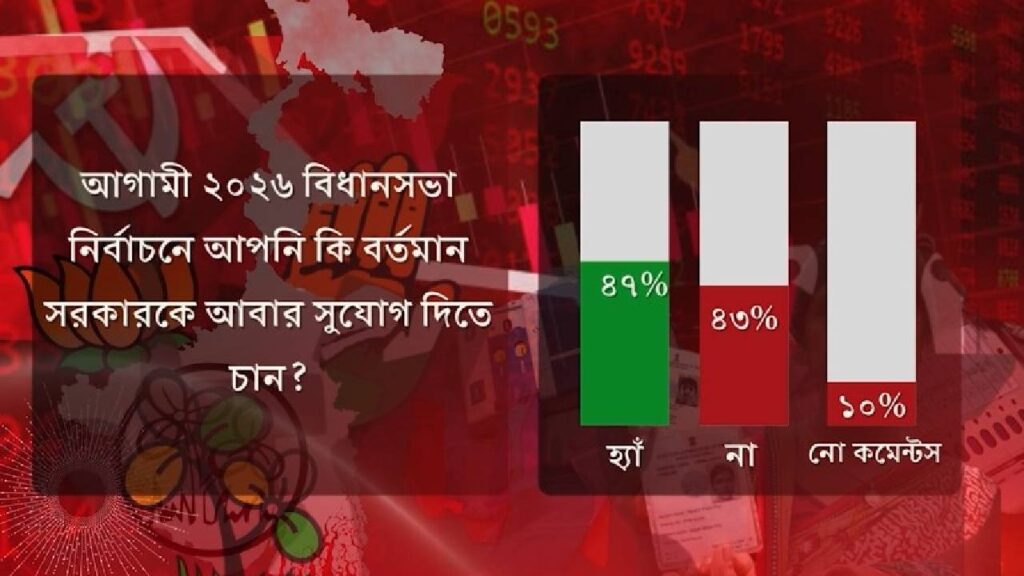 ২০২৬ বিধানসভা নির্বাচনে বর্তমান সরকারকে আবার সুযোগ দিতে চান কিনা প্রশ্নে হ্যাঁয়ের পক্ষে ভোট আসে ৪৭%, না য়ের পক্ষে ৪৩% এবং নো কমেন্টসের পক্ষে ১০% ভোট পড়ে।