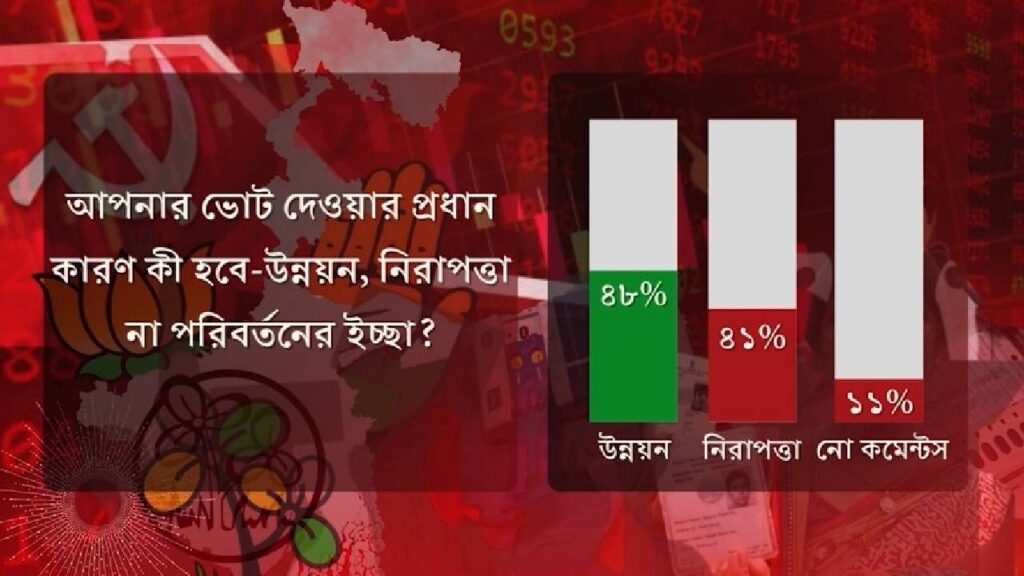 ভোট দেওয়ার প্রধান কারণ হিসেবে উন্নয়ন, নিরাপত্তা এবং পরিবর্তনের পক্ষে ভোট পড়ে যথাক্রমে ৪৮%, ৪১% এবং ১১%। অর্থাৎ উন্নয়নকেই নির্বাচনের মূল প্রতিপাদ্য বলে মনে করেন রাজ্যের মানুষ।