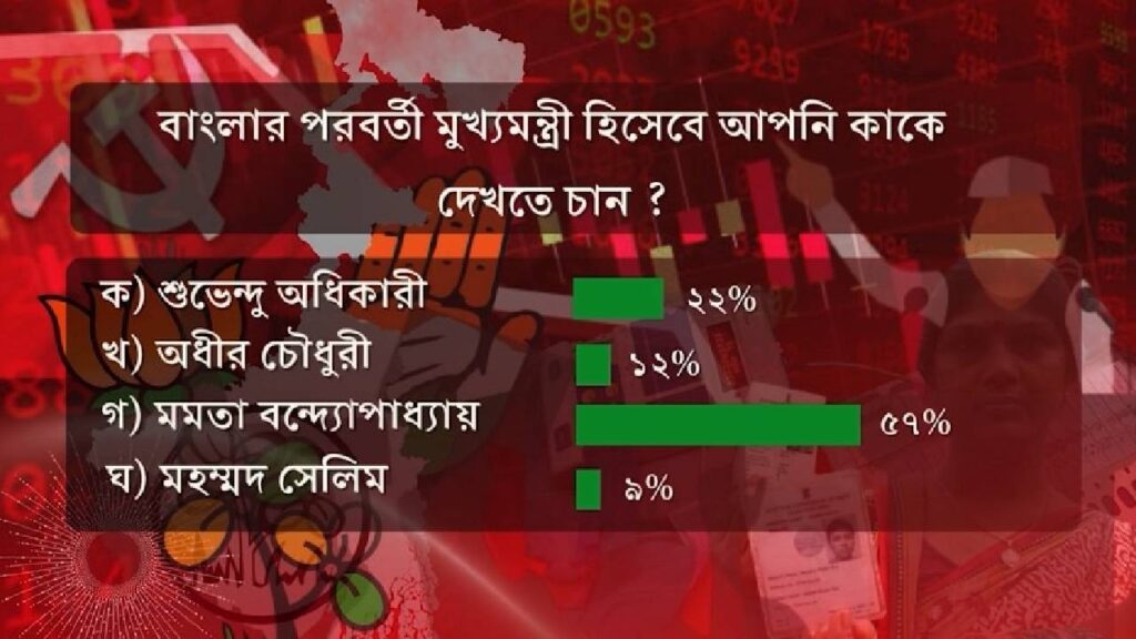 বাংলার পরবর্তী মুখ্যমন্ত্রী হিসেবে কাকে দেখতে চান এই প্রশ্নে স্বাভাবিক ভাবেই জনতার সংখ্যাগরিষ্ঠ মত পেয়েছেন মমতা বন্দ্যোপাধ্যায়। জনমত সমীক্ষায় তিনি পেয়েছেন ৫৭% সমর্থন, শুভেন্দু অধিকারী পেয়েছেন ২২% সমর্থন, অধীর চৌধুরী পেয়েছেন ১২% সমর্থন, মহম্মদ সেলিম পেয়েছেন ৯% সমর্থন।