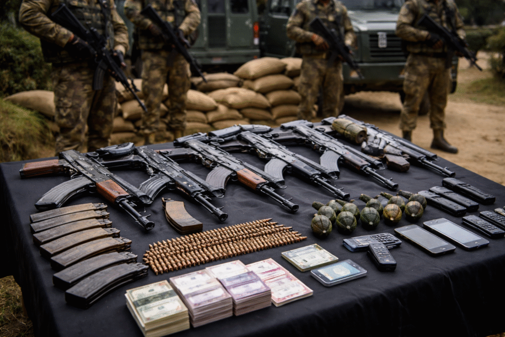 নিরাপত্তা বাহিনী ও কেন্দ্রীয় সংস্থার যৌথ অভিযানে গত কয়েক দিনে মোট ১৯টি জায়গায় তল্লাশি চালানো হয়। এই তল্লাশি অভিযান চলে মূলত তিনটি রাজ্যে জম্মু ও কাশ্মীর, রাজস্থান, হরিয়ানা এই অভিযানেই উদ্ধার হয় বিপুল পরিমাণ অস্ত্রশস্ত্র যার মধ্যে রয়েছে একাধিক AK-47, AK-Krinkov রাইফেল, পিস্তল, হ্যান্ড গ্রেনেড এবং ইলেকট্রনিক ডিভাইস।