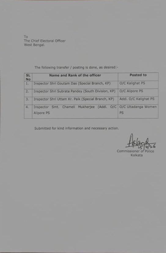 শুধু কালীঘাট নয়, শহরের আরও দুটি গুরুত্বপূর্ণ থানাতেও রদবদল ঘটানো হয়েছে, আলিপুর থানা: নতুন ওসি হিসেবে দায়িত্ব পেয়েছেন সুব্রত পাণ্ডে, উল্টোডাঙা মহিলা থানা: দায়িত্বে এসেছেন চামেলি মুখোপাধ্যায়, যিনি আগে আলিপুর থানার অতিরিক্ত ওসি ছিলেন এই পরিবর্তনগুলি একসঙ্গে ঘটানোয় স্পষ্ট, কমিশন শহরের আইনশৃঙ্খলা ব্যবস্থাকে নতুনভাবে সাজাতে চাইছে ভোটের আগে।