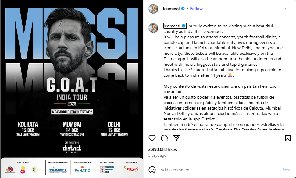 মেসি ম্যাজিক দেখার জন্য দিন গুনছেন ফুটবলপ্রেমীরা। অপেক্ষা আর দুই মাস। কিন্তু দিন যত এগিয়ে আসছে ততই বাড়ছে উন্মাদনা। তারপরেই শহরে পা রাখতে চলেছেন বিশ্বকাপজয়ী তারকা ফুটবলার লিওনেল মেসি। GOAT কাপ ও কনসার্টে অংশ নিতে ভারতে আসছেন তিনি। তাকে এক ঝলক দেখার আশায় বুক বাঁধছেন ভক্তরা। মেসির ভারতে আসার খবর ছড়িয়ে পড়ার পর থেকেই চর্চা চলিছিল টিকিট কোথায় পাওয়া যাবে সেই নিয়ে। কোথা থেকে কাটতে হবে, তার দাম ইত্যাদি নান বিষয় নিয়ে। এবার সমস্ত জল্পনার অবসান হলো। ৮ তারিখ থেকেই শুরু হয়ে গেল টিকিট বিক্রি। টিকিটের মূল্য জেনে নিন (Lionel Messi)।