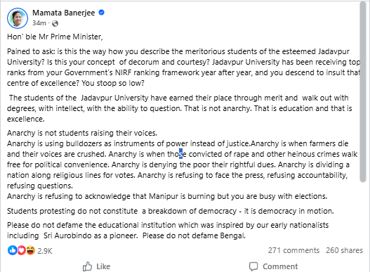 মমতা বন্দ্যোপাধ্যায় তাঁর বার্তায় উল্লেখ করেন, যাদবপুর বিশ্ববিদ্যালয় প্রতি বছর National Institutional Ranking Framework-এর তালিকায় শীর্ষস্থান অর্জন করে। সেই প্রতিষ্ঠানকে অপমান করা মানে দেশের শিক্ষাব্যবস্থাকেই প্রশ্নের মুখে ফেলা। তিনি জোর দিয়ে বলেন, এই বিশ্ববিদ্যালয়ের ছাত্রছাত্রীরা মেধাবী, প্রশ্ন করার ক্ষমতা রাখে এবং সেটাই শিক্ষার আসল চেহারা।