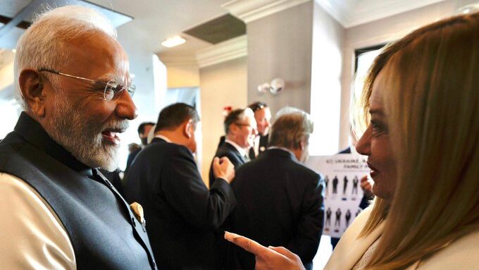 জি৭ সম্মেলনের ফাঁকে মুখোমুখি হয়েছিলেন প্রধানমন্ত্রী নরেন্দ্র মোদী ও জর্জিয়া মেলোনি(Melodi)। আর দেখা হতেই দুজনের মধ্যে হওয়া আলাপচারিতা সোশ্যাল মিডিয়ায় মাধ্যমে ফিরিয়ে এনেছে সেই পুরনো ‘মেলোডি’ স্মৃতি। সোশ্যাল মিডিয়ায় ব্যাপকভাবে শেয়ার হওয়া একটি ভিডিওতে দেখা যাচ্ছে যে দুই নেতা একে অপরের সঙ্গে দেখা হতেই করমর্দন করছেন। একে অপরের কুশল সম্পর্কে জিজ্ঞাসা করছেন। কুশল বিনিময়ের মধ্যেই প্রধানমন্ত্রী নরেন্দ্র মোদীর উদ্দেশ্যে মেলোনিকে বলতে শোনা গিয়েছে, ‘আপনি সেরা, আমি আপনার মতো হতে চেষ্টা করছি।’ জবাবে প্রধানমন্ত্রী নরেন্দ্র মোদীকে হাসতে এবং ইতালির প্রধানমন্ত্রীর প্রতি ‘থাম্বস আপ’ ইশারা করতে দেখা গেছে।অন্যদিকে মেলোনির সঙ্গে সাক্ষাতের পর প্রধানমন্ত্রী মোদী বলেন, ‘ভারত ও ইতালির মধ্যে সম্পর্কের গভীরতা আরও বাড়ছে। ভবিষ্যতে দুই দেশ একে অপরকে সহযোগিতার মাধ্যমে আরও এগিয়ে যাবে বলেই আশা করছি।’