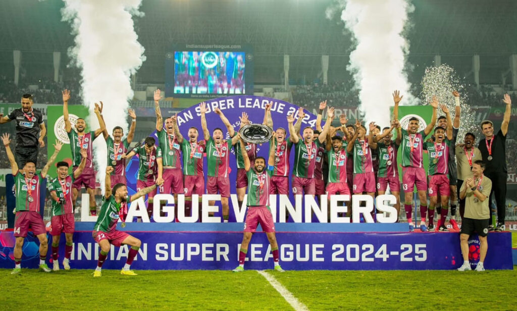 প্রিয় দলের খেলোয়াড়দের হাতে লিগ শিল্ড ওঠার মুহূর্তকে স্মরণীয় করে রাখতে শনিবার যুবভারতীর গ্যালারিতে সেলিব্রেশনের আগাম প্রস্তুতি নিয়েই উপস্থিত ছিলেন প্রায় ৬২ হাজার সবুজ-মেরুন সমর্থক। সবুজ মেরুন জনাকে হতাশ করেননি ফুটবলাররা। এফসি গোয়াকে ২-০ গোলে হারিয়ে মধুর প্রতিশোধটাও নিয়ে নিল মোহনবাগান সুপার জায়ান্ট। প্রথম লেগের ম্যাচে এই গোয়ার কাছেই দুই এক গোলে হারতে হয়েছিল। শনিবার সন্ধ্যায় সেই গোয়াকেই দ্বিতীয় লেগের ম্যাচে ২ গোলে হারালো মোহনবাগান (Mohun Bagan beats FC Goa)।