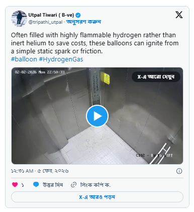 ভাইরাল হওয়া সিসিটিভি ফুটেজে দেখা যাচ্ছে, এক ব্যক্তি প্লাস্টিকের ব্যাগ ভর্তি একাধিক হাইড্রোজেন বেলুন নিয়ে লিফটে ঢুকছেন। সেই সময় লিফটের ভিতরে আগে থেকেই ছিলেন এক মহিলা ও আরও এক পুরুষ। কয়েক সেকেন্ডের মধ্যেই বিকট শব্দে বেলুনগুলো ফেটে যায়। মুহূর্তে লিফটের ভিতরে আগুন ছড়িয়ে পড়ে। লিফটের দরজা তখনও খোলা থাকায় তিনজন দ্রুত বাইরে বেরিয়ে আসতে সক্ষম হন। না হলে এই ঘটনা যে ভয়াবহ ট্র্যাজেডিতে পরিণত হতে পারত, তা সহজেই অনুমেয়।