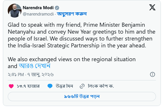 বিশ্ব রাজনীতির এই অস্থিরতার মধ্যেই বুধবার সকালে ইজ়রায়েলের প্রধানমন্ত্রী বেঞ্জামিন নেতানিয়াহুর সঙ্গে ফোনে কথা বলেন ভারতের প্রধানমন্ত্রী নরেন্দ্র মোদী। এই ফোনালাপ নিছক সৌজন্য বিনিময়ের মধ্যে সীমাবদ্ধ ছিল না, বরং তা বহন করে গুরুত্বপূর্ণ কৌশলগত বার্তা। প্রধানমন্ত্রী মোদী তাঁর এক্স (সাবেক টুইটার) হ্যান্ডলে লেখেন,“আমার বন্ধু, ইজ়রায়েলের প্রধানমন্ত্রী বেঞ্জামিন নেতানিয়াহুর সঙ্গে কথা বলতে পেরে এবং তাঁকে ও ইজ়রায়েলের জনগণকে নববর্ষের শুভেচ্ছা জানাতে পেরে আমি আনন্দিত। আমরা আগামী বছরে ভারত-ইজ়রায়েল কৌশলগত অংশীদারিত্বকে আরও শক্তিশালী করার উপায় নিয়ে আলোচনা করেছি।” এই বক্তব্য থেকেই স্পষ্ট, ভারত ও ইজ়রায়েলের সম্পর্ক কেবল কূটনৈতিক স্তরে নয়, বরং কৌশলগত অংশীদারিত্বের পর্যায়ে পৌঁছেছে।