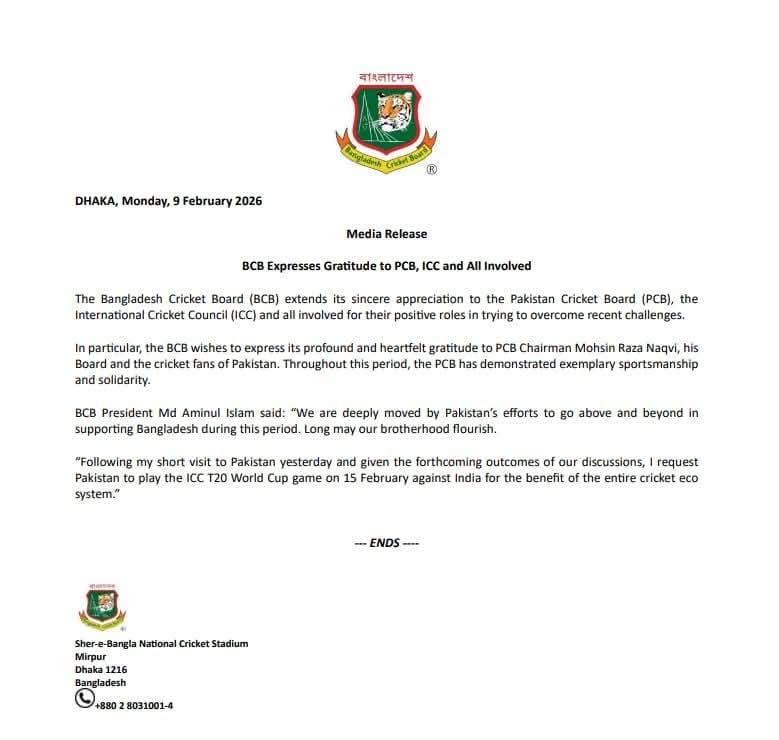 ঘটনাচক্রে, সোমবার রাতে বিসিবি-র তরফেও প্রথমে একটি বিবৃতি প্রকাশ করে আনুষ্ঠানিক ভাবে পাকিস্তানকে ভারত-ম্যাচ খেলার অনুরোধ জানানো হয়। বাংলাদেশ ক্রিকেট বোর্ড বিবৃতিতে লেখে, ‘সম্প্রতি বিভিন্ন বিষয়ে যে সমস্যা তৈরি হয়েছে তাতে পাকিস্তান ক্রিকেট বোর্ড, আইসিসি এবং বাকি সব পক্ষের ইতিবাচক ভূমিকার জন্য কৃতজ্ঞতা জানাতে চায় বিসিবি। বিশেষ করে কৃতজ্ঞতা প্রাপ্য পিসিবি চেয়ারম্যান মহসিন রাজা নকভি, তাঁর বোর্ড এবং পাকিস্তানের সমর্থকদের (Pakistan)।’