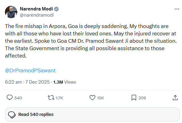 দেশবাসীর মতো এই দুর্ঘটনায় গভীর শোক প্রকাশ করেছেন প্রধানমন্ত্রী নরেন্দ্র মোদী। এক্স (X)-এ দেওয়া পোস্টে তিনি এই ঘটনাকে বলেছেন ‘গভীর দুঃখজনক ও ট্র্যাজিক’। নিহতদের পরিবারের প্রতি সমবেদনা জানিয়ে তিনি লিখেছেন, “গোয়ার আরপোরায় অগ্নিকাণ্ডের ঘটনাটি অত্যন্ত দুঃখজনক। যারা তাঁদের প্রিয়জনকে হারিয়েছেন তাঁদের সকলের প্রতি আমার সমবেদনা। আহতরা দ্রুত আরোগ্য লাভ করুক।” প্রধানমন্ত্রী জানিয়েছেন, গোয়ার মুখ্যমন্ত্রী ডঃ প্রমোদ সাওয়ান্তের সঙ্গে তাঁর কথা হয়েছে এবং রাজ্য সরকার ক্ষতিগ্রস্তদের সবরকম সহায়তা করছে। একইসঙ্গে প্রধানমন্ত্রী জাতীয় ত্রাণ তহবিল (PMNRF) থেকে