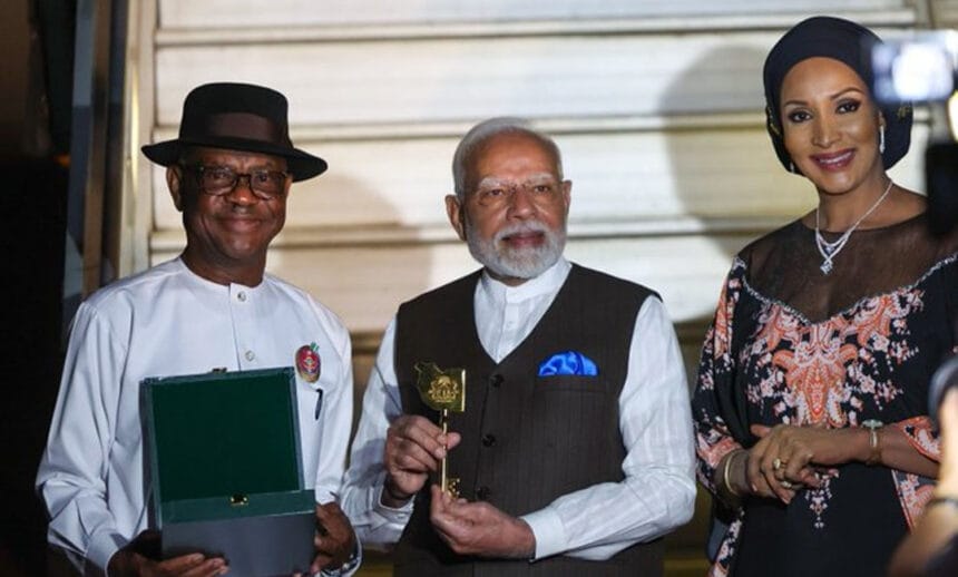 শনিবারই নাইজেরিয়ায় পৌঁছন প্রধানমন্ত্রী নরেন্দ্র মোদি। আবুজায় তাঁকে ‘কি টু দ্য সিটি’ উপহার দেওয়া হয়। প্রধানমন্ত্রী মোদির প্রতি সম্মান ও বিশ্বাসের প্রতীক হিসাবেই এই উপহার দেওয়া হয়। প্রধানমন্ত্রী মোদীকে স্বাগত জানাতে মারাঠি লাভনি নৃত্যও প্রদর্শন করা হয়। নাইজেরিয়ায় বসবাসকারী মারাঠি সম্প্রদায়কে ধন্যবাদ জানান প্রধানমন্ত্রী। নাইজেরিয়া থেকে ব্রাজিল, গুয়ানায় যাবেন প্রধানমন্ত্রী মোদি।