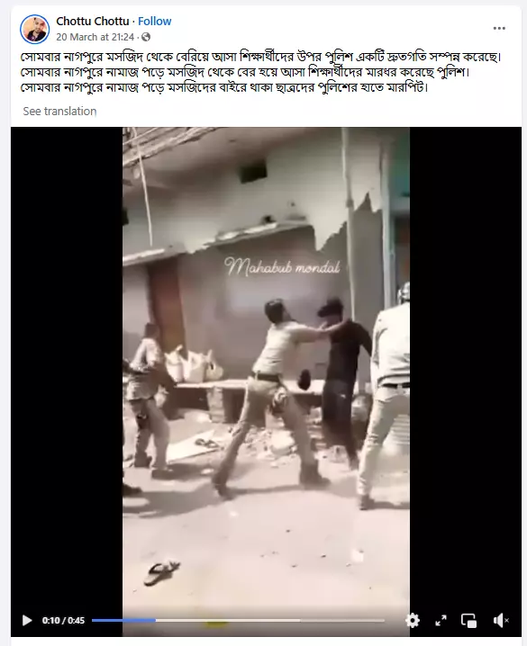 এক ফেসবুক ব্যবহারকারী ভিডিওটি শেয়ার করে ক্যাপশনে দাবি করে, “সোমবার নাগপুরে মসজিদ থেকে বেরিয়ে আসা শিক্ষার্থীদের উপর পুলিশ একটি দ্রুতগতি সম্পন্ন করেছে। সোমবার নাগপুরে নামাজ পড়ে মসজিদ থেকে বের হয়ে আসা শিক্ষার্থীদের মারধর করেছে পুলিশ। সোমবার নাগপুরে নামাজ পড়ে মসজিদের বাইরে থাকা ছাত্রদের পুলিশের হাতে মারপিট।”
