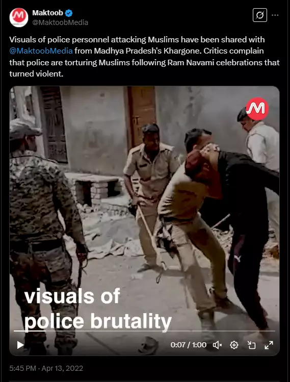 এরপর, প্রতিবেদনটির সূত্র ধরে, আমরা মাকতুব মিডিয়ার এক্স হ্যান্ডেলে ১৩ এপ্রিল, ২০২২-এর একটি পোস্ট পাই যেখানে ভাইরাল ভিডিওর একটি দীর্ঘতর সংস্করণ পাওয়া যায়। পোস্টটি অনুসারে ২০২২ সালে খারগোনে রাম নবমী উদযাপনকে কেন্দ্র করে হিংসা ছড়ানোর পর, খারগোনের শঙ্কর নগরে পুলিশ ভিডিওর দুই মুসলিম যুবককে মারধর করে।