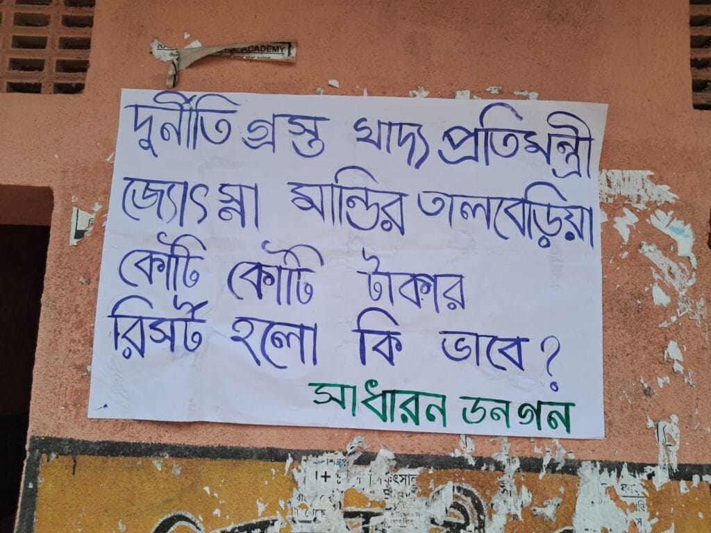 ওই পোষ্টার গুলিতে ‘খাদ্য প্রতিমন্ত্রী জ্যোৎস্না মাণ্ডির এত জায়গা জমি হলো কীভাবে?’ থেকে শুরু করে তাঁর ‘শোরুম গুলো কীভাবে হল’। ‘জঙ্গল মহলের আদিবাসীদের রেশনের কাটমানির টাকা কোথায় গেল?’, তালবেড়িয়ায় কোটি কোটি টাকার রিসর্ট হল কী ভাবে’ বলে প্রশ্ন তোলা হয়েছে। যদিও রাতের অন্ধকারে কে বা কারা এই পোষ্টার দিল বিষয়টি স্পষ্ট নয় কারও কাছেই।