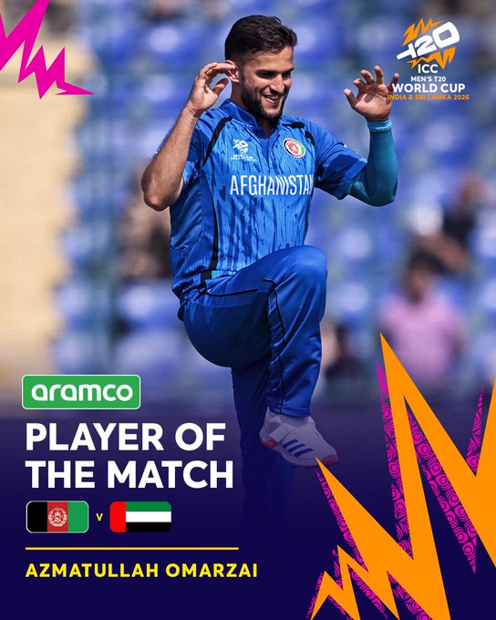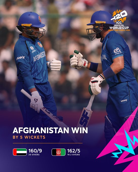 টস জিতে ফিল্ডিংয়ের সিদ্ধান্ত নেয় আফগানিস্তান। ৯ উইকেট হারিয়ে ১৬০ রান তোলে UAE। বল হাতে আগুন জ্বালেন আজমাতুল্লাহ ওমরজাই। চার ওভারে মাত্র ১৫ রানের বিনিময় নেন ৪ উইকেট। দুই উইকেট পেয়েছেন মুজিব-উর-রহমান।