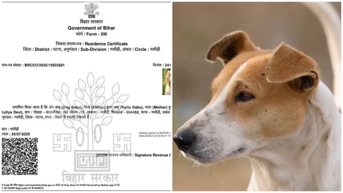 সরকারি ওই নথি অনুযায়ী, বাসিন্দার নাম ‘ডগ বাবু।’ আর শংসাপত্রে পিতার নাম লেখা হয়েছে ‘কুত্তা বাবু’, মাতার নাম ‘কুত্তিয়া দেবী।’ পুরো ঠিকানাও দেওয়া হয়েছে-পাটনা জেলার মসৌড়ির কাঞ্জোলি গ্রাম(Residential Certificate)।এতে মসৌরির কৌলিচক ওয়ার্ড-১৫-এর একটি ঠিকানাও ছিল। বিহার সরকারের সিলমোহরও রয়েছে ওই শংসাপত্রে। নীচে রয়েছে আঞ্চলিক অফিসের রাজস্ব আধিকারিক মুরারী চৌহানের ডিজিটাল স্বাক্ষর।এমনকী ওই নথিতে কুকুরটির ছবি পর্যন্ত সংযুক্ত রয়েছে।আর এই ঘটনা প্রকাশ্যে আসতেই শোরগোল পড়ে গিয়েছে ভোটমুখী বিহারে।এরপরেই প্রশ্ন উঠছে, এটি কী ভাবে সম্ভব? বিহার সরকার বা সংশ্লিষ্ট দফতর কীভাবে এই ধরণের তথ্য যাচাই না করেই একটি সরকারি শংসাপত্র জারি করতে পারল?