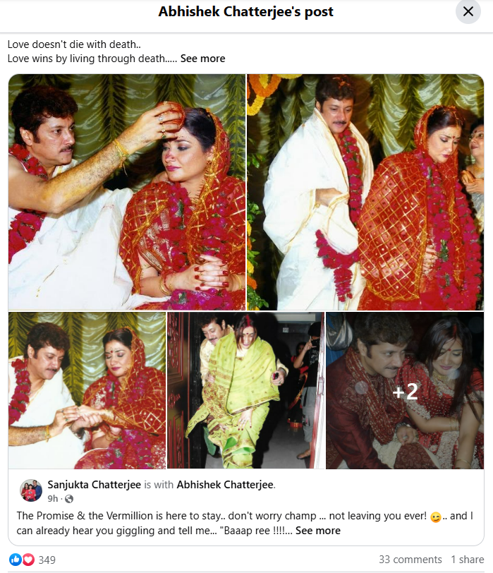 অভিনেতা অভিষেকের স্ত্রী সংযুক্তা (Sanjukta Chatterjee) ১৭তম বিবাহ বার্ষিকী উপলক্ষে তাঁদের বিয়ের কয়েকটি ছবি পোস্ট করেন। তাঁর মতে, ‘মৃত্যুর সাথে ভালোবাসা কখনও মরে না। মৃত্যুর মধ্য দিয়ে ভালোবাসা জয়ী হয়।’ অর্থাৎ অভিনেতা সর্বদাই স্ত্রী ও মেয়ের পাশে রয়েছেন, যেমন আগে থাকতেন, এমনটাই মনে করেন অভিনেতার স্ত্রী। আর এটাও সত্যি যে, মৃত্যুর সাথে সাথে ভালোবাসা কখনও শেষ হয় না। সত্যিকারের ভালোবাসা থেকে যায় আজীবন।