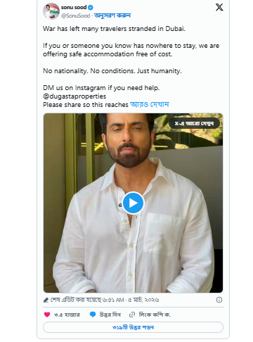 একটি ভিডিও বার্তায় সোনু সুদ বলেন, “আমাদের হিন্দুস্তানি ভাইরা, বা যে দেশের নাগরিকরাই দুবাইয়ে আটকে পড়েছেন, তাঁরা দয়া করে আমাকে মেসেজ করুন। আমি আপনাদের বিনামূল্যে থাকার ব্যবস্থা করব, যতক্ষণ না আপনারা নিরাপদে বাড়ি ফিরতে পারছেন।” এই বক্তব্যে স্পষ্ট এটি কেবল জাতীয়তার প্রশ্ন নয়, মানবিকতার প্রশ্ন। তাঁর বার্তায় ‘মানবিকতার খাতিরে’ শব্দবন্ধটি বিশেষভাবে নজর কেড়েছে। যুদ্ধ বা আন্তর্জাতিক রাজনীতির জটিলতার ঊর্ধ্বে উঠে তিনি সাধারণ মানুষের নিরাপত্তা ও স্বস্তিকে প্রাধান্য দিয়েছেন।