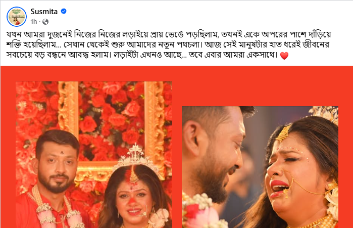 কয়েক দিন ধরেই ভাইয়ের বিয়ে নিয়ে ব্যস্ত ছিলেন সুস্মিতা। কেনাকাটা, আচার-অনুষ্ঠান সবকিছুই তিনি তুলে ধরছিলেন ভিডিওতে। কিন্তু কেউই আঁচ করতে পারেননি, এই আনন্দের মাঝেই নিজের জীবনের এমন বড় সিদ্ধান্ত লুকিয়ে রেখেছিলেন তিনি। মঙ্গলবার হঠাৎই ফেসবুকে একটি ছবি পোস্ট করে তিনি জানান, তিনিও বিয়ের পিঁড়িতে বসেছেন। যদিও ছবিতে কারও মুখ স্পষ্ট নয়, ফলে রহস্য আরও ঘনীভূত হয়েছে।