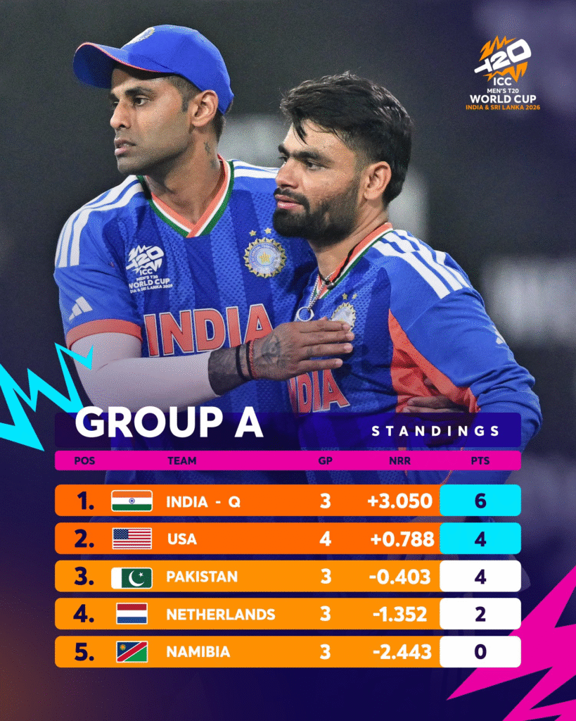 আমেরিকার কোনও ম্যাচ বাকি নেই। তাদের সুপার এইটে ওঠা অন্য দলের খেলার উপর নির্ভর করছে। তবে সেটা একপ্রকার অসম্ভব। পাকিস্তান নামিবিয়াকে হারালে বিদায় নেবে আমেরিকা। পাকিস্তান হারলে সুযোগ থাকবে তাদের। সে ক্ষেত্রে ভারতের কাছে হারতে হবে নেদারল্যান্ডকে। বা ভারত হারলেও তফাত কম থাকতে হবে। সে ক্ষেত্রে পয়েন্ট সমান হলেও নেট রানরেটে নক আউটে যাবে আমেরিকা।