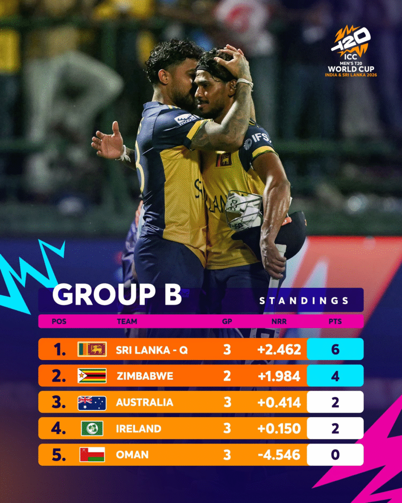মঙ্গলবার আয়ারল্যান্ডকে হারাতে পারলেই সুপার এইটে উঠে যাবে জিম্বাবোয়ে। শ্রীলঙ্কায় বৃষ্টি হচ্ছে। ফলে খেলা যদি ভেস্তে যায় তা হলে ১ পয়েন্ট পাবে জিম্বাবোয়ে। সে ক্ষেত্রেও সুপার এইটে উঠে যাবে তারা। শ্রীলঙ্কার বিরুদ্ধে শেষ ম্যাচ নিয়মরক্ষার হয়ে দাঁড়াবে।