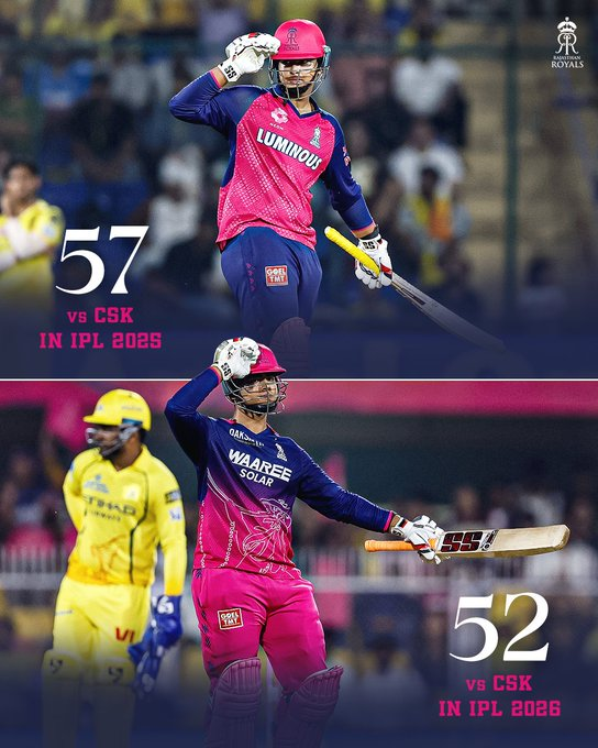 চেন্নাইয়ের বিরুদ্ধে মাঠে আবারও দেখা গেল বৈভব ঝড়। সেই ঝড়েই খড়কুটোর মতো উড়ে গেল ধোঁয়াহীন চেন্নাই। এক তরফ লড়াইয়ের মঞ্চেও দাপুটে জয়ের গল্প লিখলেন দুই তরুণ তুর্কি। ১২৮ রান তাড়া করতে নেমে খুব সহজেই সি রান তুলে ফেলল রাজস্থান। মাত্র ১২.১ ওভারেই জয় নিশ্চিত করে তারা। CSK-এর ১৯.৪ ওভারে করা ১২৭ রান যেন মুহূর্তেই ফিকে হয়ে যায় রাজস্থানের আগ্রাসী ব্যাটিংয়ের সামনে। প্রথম মাসাথেই রাজস্থান স্পষ্ট বার্তা দিয়ে রাখল এই মনে তাঁরা এবার জিততে এসেছেন (Vaibhav Sooryavanshi)।