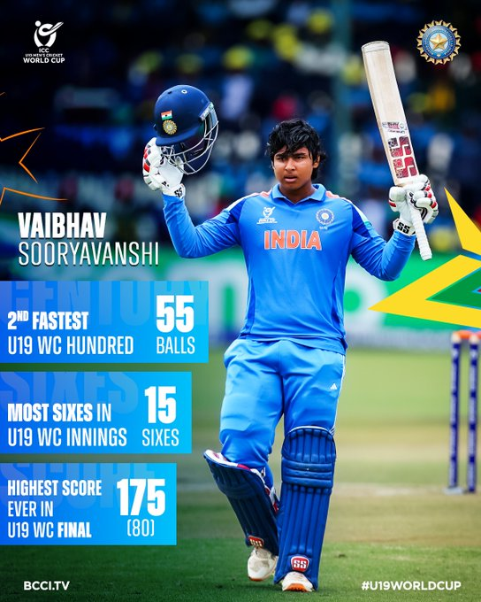 ইংল্যান্ডের বিরুদ্ধে বিশ্বকাপের ফাইনাল ম্যাচে টস জিতে ভারত ব্যাট করার সিদ্ধান্ত নেয়। তবে শুরুতেই ভারতীয় শিবিরে ধাক্কা আসে। চতুর্থ ওভারেই আউট হয়ে সাজঘরে ফেরেন অ্যারন জর্জ। এরপর ইনিংসের ভার নিজের কাঁধে তুলে নেন বৈভব সূর্যবংশী ও আয়ুষ মাত্রে। এটা অনূর্ধ্ব ১৯ বিশ্বকাপে দ্বিতীয় দ্রুততম সেঞ্চুরি এবং দ্রুততম ১৫০। পাশাপাশি অনূর্ধ্ব ১৯ বিশ্বকাপ ফাইনালেরও এটা দ্রুততম সেঞ্চুরি এবং অনূর্ধ্ব ১৯ বিশ্বকাপে সর্বোচ্চ স্কোর। ১০০ করতে নেয় মাত্র ৫৫ বল।