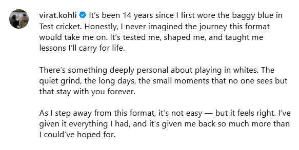 সমাজমাধ্যমে কোহলি(Virat Kohli) লিখেছেন, ‘‘১৪ বছর আগে প্রথম টেস্ট ক্রিকেটের নীল ব্যাগি টুপি পড়েছিলাম। সত্যি বলতে তখন জানতাম না, ক্রিকেটের এই ফরম্যাট আমাকে কতটা এগিয়ে নিয়ে যাবে। কল্পনাও করিনি। এই ফরম্যাট আমার পরীক্ষা নিয়েছে। আমাকে তৈরি করেছে। আমাকে শিক্ষা দিয়েছে। সারা জীবন এই শিক্ষা বহন করব।’’ ক্রিকেটে ১০ হাজার রানের মাইলস্টোন থেকে মাত্র ৭৭০ রান দূরে ছিলেন। কিন্তু তার আগেই থেমে গেলেন বিরাট।